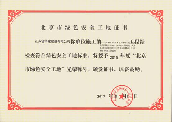 长阳天地一标段项目荣获北京市绿色安全工地 时间:2017-07-27 3398 近日,从北京市住房和城乡建设委员会传来喜讯,由北京公司总包承建的长阳天地01-12-02地块01#商务办公楼等8项(1#、2#商务办公楼)标段项目荣获 “北京市绿色安全工地”光荣称号,并获颁证书。 北京公司一直高度重视现场标准化和绿色施工管理工作,并以创优为抓手,带动现场标准化管理、安全管理、绿色施工等现场工作的全面开展,积极开展绿色施工技术的应用,努力提高绿色施工水平,充分展现出了江苏华建良好的企业形象与高效的施工管理水平,为城市的建设与环境保护贡献力量。