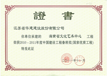 海南省文化艺术中心(海南省歌舞剧院)是海南省委、省政府在“十一五规划” 期间实施的重点惠民公共文化设施,是海南文艺繁荣发展的新座标。坐落于海南文化公园中轴线上,工程建筑面积23500平方米,东西长128米,南北宽113米,高33米,包括可同时容纳1300人的剧场、演出辅助用房、排练房等建筑,建筑造型酷似一只展翅飞翔的大鸟。工程总造价1.94亿元。先后获得2009年度国家AAA级安全文明标准化诚信工地、全国优秀质量管理小组称号及全国质量信得过班组称号等多项荣誉。通过技术创新,获得省级工法两项、省级QC成果两项、省级优秀技术论文三篇,被评为海南省新技术应用示范工程。2011年11月,荣获2010-2011年度中国建设工程鲁班奖(国家优质工程),是公司获得的第16个“鲁班奖”项目。