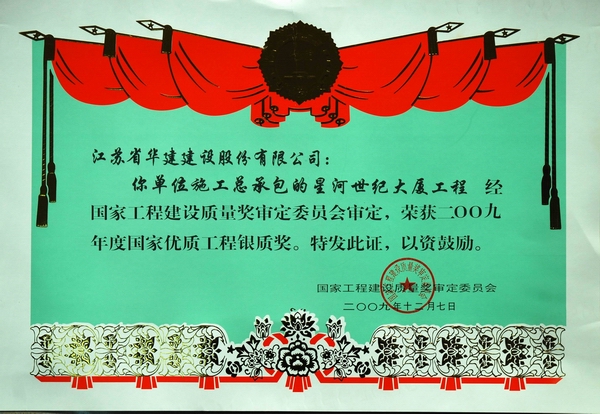 星河世纪大厦 时间:2010-01-19 8395 该工程位于深圳市福田区深南大道南与彩田路西交汇处,是深圳市中心区东门标志性建筑。该工程一裙三塔,32-39层,高173.2米,总建筑面积156680平方米,是集办公、商业、住宅为一体的综合楼。 该工程先后荣获2006年度“深圳市安全生产文明施工优良工地”、2007年度深圳市优质工程“金牛奖”第一名、2007年度广东省优良样板工程奖、2007年度江苏省“扬子杯”省外优质工程奖,2009年12月被评为2009年度国家优质工程银质奖。