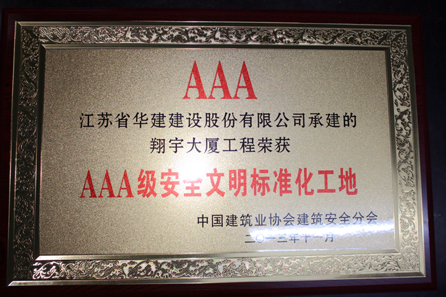 淮安翔宇大厦位于淮安市新城区重要地段,是淮安市重点工程,2011年7月开工(在建),框剪结构,为22层、总高度88.6米的高层建筑,由南楼(办公用房)、中楼(大会堂和会议中心)、北楼(一至四层为对外服务大厅、通讯交换机房和食堂等辅助用房)及裙房(一层)和地下室(水池泵房、交配电房和汽车停车库)组成,占地51亩、建筑面积9万平方米,其中地下停车场面积约1.8万平方米,工作量5亿元。工程荣获2012年江苏省建筑施工文明工地称号,是淮安市安全文明施工观摩工地。2013年11月,该工程被中建协安全分会表彰为AAA级安全文明标准化工地。