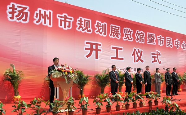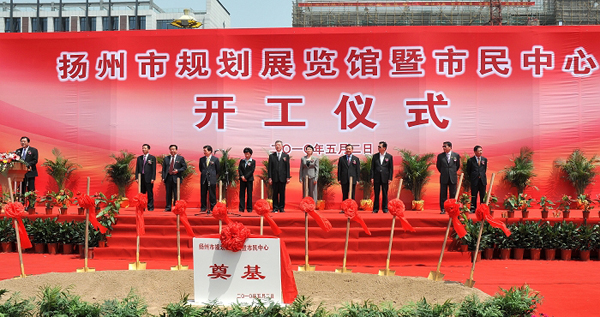 开工仪式由副市长陈扬主持,市政府副秘书长、建设局局长王骏对项目具体情况作了介绍,建工控股董事长陆金龙代表建设代理方作表态发言,他提出要抓好三个方面的重点工作,一是举全系统之力组建项目管理的精英团队,着力体现扬州建筑大市的实力和水平。二是高起点规划,高标准建设,着力打造体现扬州文化底蕴、彰显现代个性的标志性建筑。三是切实加强组织领导,着力展示建工系统干部职工的精神风貌。市长谢正义代表市委、市政府致辞,他指出这个项目的建设对进一步提升城市基础设施建设水平,完善城市功能,提升城市品质,建设“创新扬州、精致扬州、幸福扬州”,都具有深远和重要的意义。他对该项目提四点要求:一要深化方案,用城市客厅的理念,把这座建筑打造成扬州新的建筑标杆、节能的标杆;二要严格管理,确保安全施工和工程质量,争创“鲁班奖”;三要精心组织,确保工程进度,力争2011年底竣工;四要坚持原则,确保工程廉洁,大家平平安安。希望参与建设的各单位统一思想、明确目标,努力把扬州市规划展示馆与市民中心建设成优质工程、品牌工程、民心工程,为建设精致扬州增添一抹亮丽的风景线。