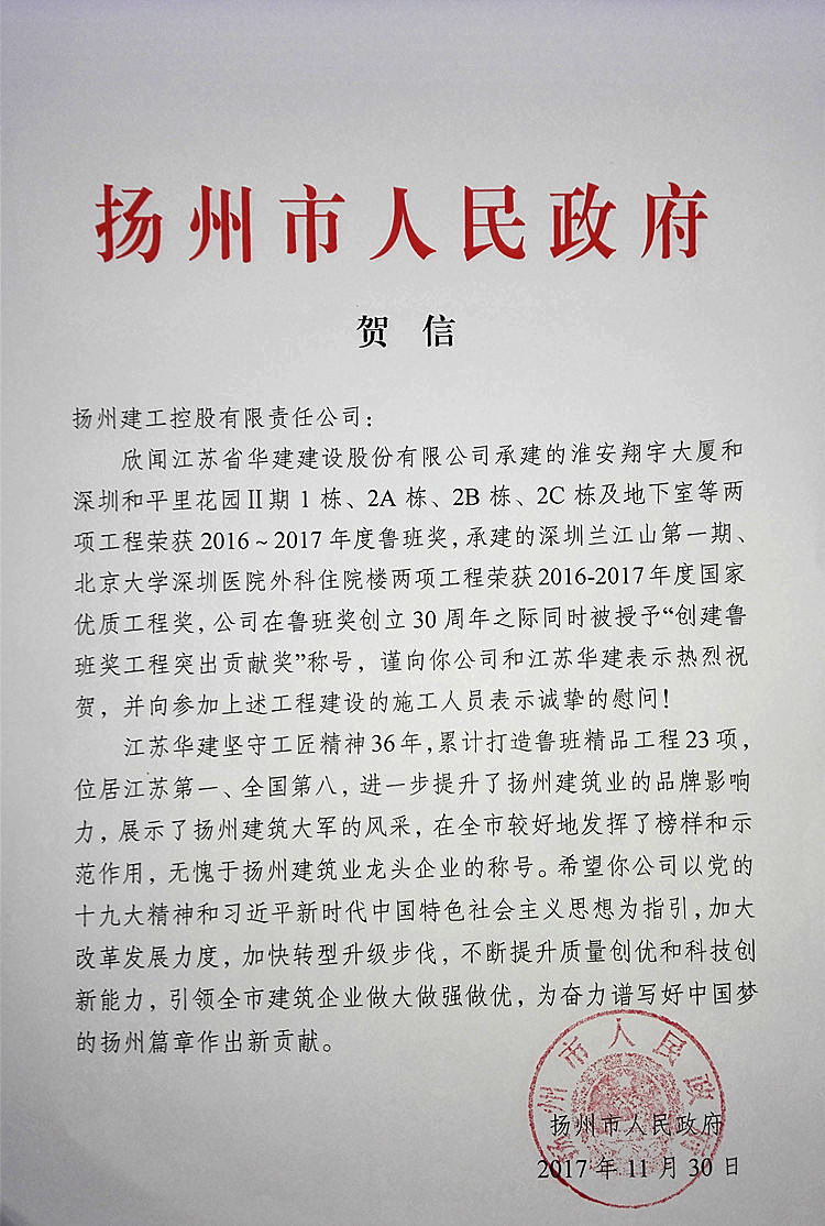 11月30日,扬州市人民政府专门发来贺信,对公司承建的淮安翔宇大厦、深圳和平里花园Ⅱ期1栋 、2A栋、2B栋、2C栋及地下室两工程荣获2016-2017年度鲁班奖;深圳兰江山第一期、北京大学深圳医院外科住院楼两工程荣获2016-2017年度国家优质工程奖,以及在鲁班奖创立30周年大会上被授予“创建鲁班奖工程突出贡献奖”称号,表示热烈祝贺,并向参加上述工程建设的施工人员表示诚挚的慰问。