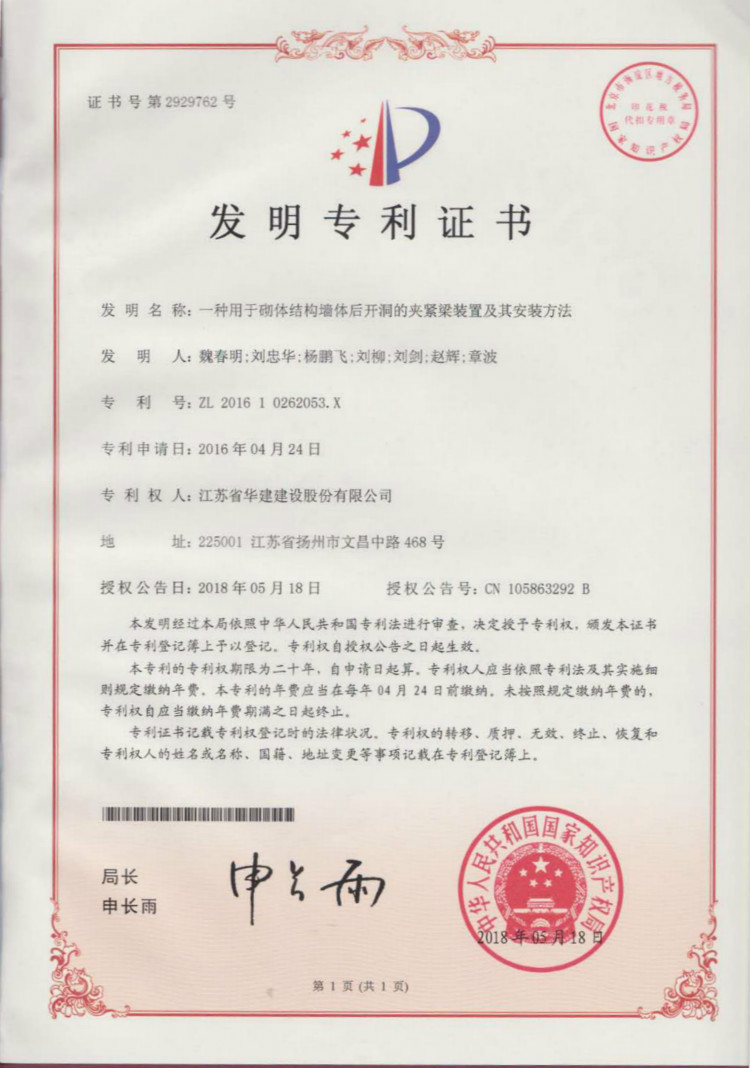江苏华建再获1项发明专利、3项实用新型专利 时间:2018-06-07 2990 日前,从国家知识产权局传来喜讯,江苏华建发布的《一种用于砌体结构墙体后开洞的夹紧梁装置及其施工方法》获得发明专利授权(专利号:ZL201610262053.X),《一种建筑板材角磨机》(专利号:ZL201720592798.2)、《一种建筑施工用钢筋切断机》(专利号:ZL201720593659.1)、《一种建筑施工用混凝土搅拌机》(专利号:ZL201720593516.0)获得实用新型专利授权。